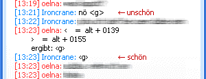 mal abgesehen davon, dass mich das staendige gegrinne schon voll abnervt, tut mir als hobbytypografen besonders die verwendung der klammern an dieser stelle weh. die regel besagt einfach, dass ausserhalb der programmierung, wie sie die wenigsten von uns aktiv betreiben, ausser html vielleicht, diese art von klammer nichts zu verloren hat. besonders nicht in einem literarischen werk, wie ein chat das ja ist. daher hab ich mir mal die muehe gemacht und fuer euch chatter, die gerne grinsen wollen, die tastaturcodes fuer die richtigen einfachen franzoesischen anfuehrungszeichen rausgesucht. alt+0139 und Alt+0155. seht euch mal das beispiel an:
